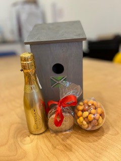 In dit vrolijke vogelhuisje vind je een flesje bubbels, een transparante kerstbal met nootjes en een zakje heerlijke zelfgebakken koekjes.